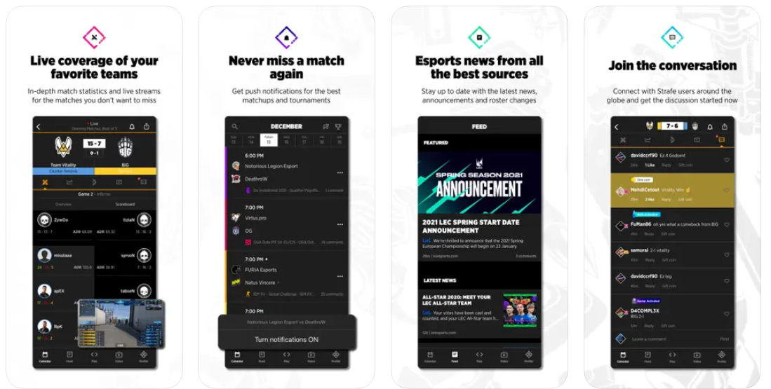 Strafe eSports is designed to provide a comprehensive esports experience. It offers live scores, real-time statistics, and news for major esports titles like CS:GO, League of Legends, and Dota 2. Users can personalize their feeds by following their favorite teams, players, and tournaments. The app includes a prediction game, Strafe Score, where users can predict match winners, earn points, and climb leaderboards. It also features a community aspect with account customization, badges, and rankings based on eSports knowledge. Additional features include match notifications, video highlights, and curated articles from popular eSports sites.