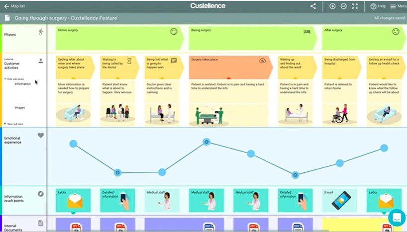 Custellence offers a flexible map structure that allows for adding lines and curves for customer empathy and shows the customer's experience, efforts, and emotions. It has a unique image collection, a variety of carefully selected icons, and multiple templates for a quick start. Supported export formats are PNG, CSV, or PDF.