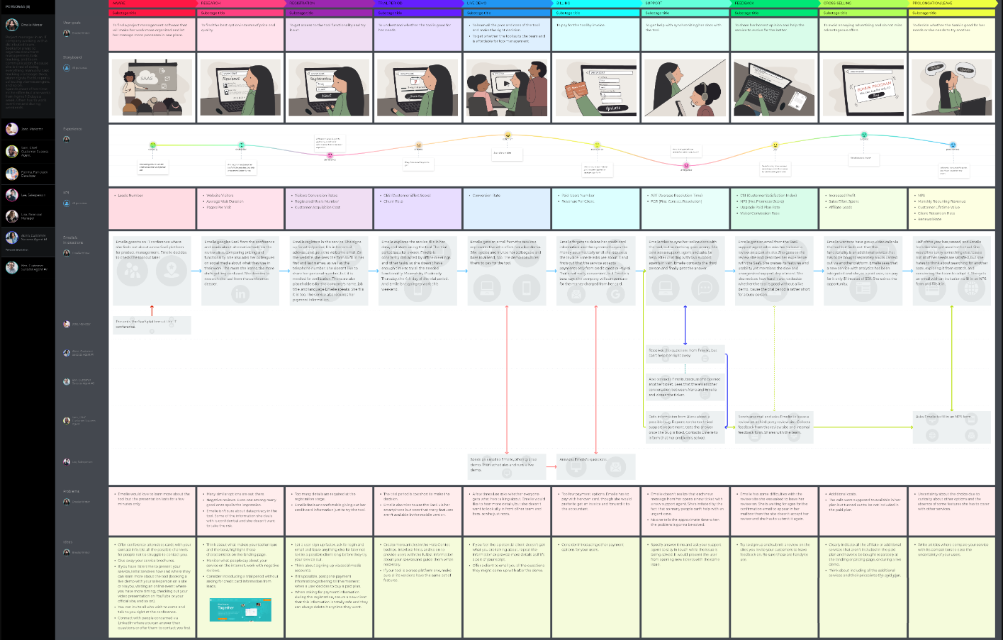 UXPressia is a dedicated customer journey mapping platform that visualizes, presents, shares, and improves customer journeys. In addition to journey mapping, it offers a buyer persona generator and impact map builders. It allows real-time online collaboration between different users, integrates with multiple data sources, and has an intuitive interface with a drag-and-drop environment.