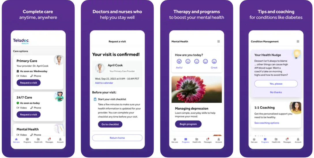Teladoc is a telehealth app that offers immediate virtual care by connecting patients to doctors, therapists, psychiatrists, nurses, and coaches 24/7 through phone or video visits. Services include primary and pediatric care, dermatology, nutrition, sexual health, and mental health. If necessary, doctors can also prescribe medication through the app and even order it from the local pharmacy of a patient’s choice.