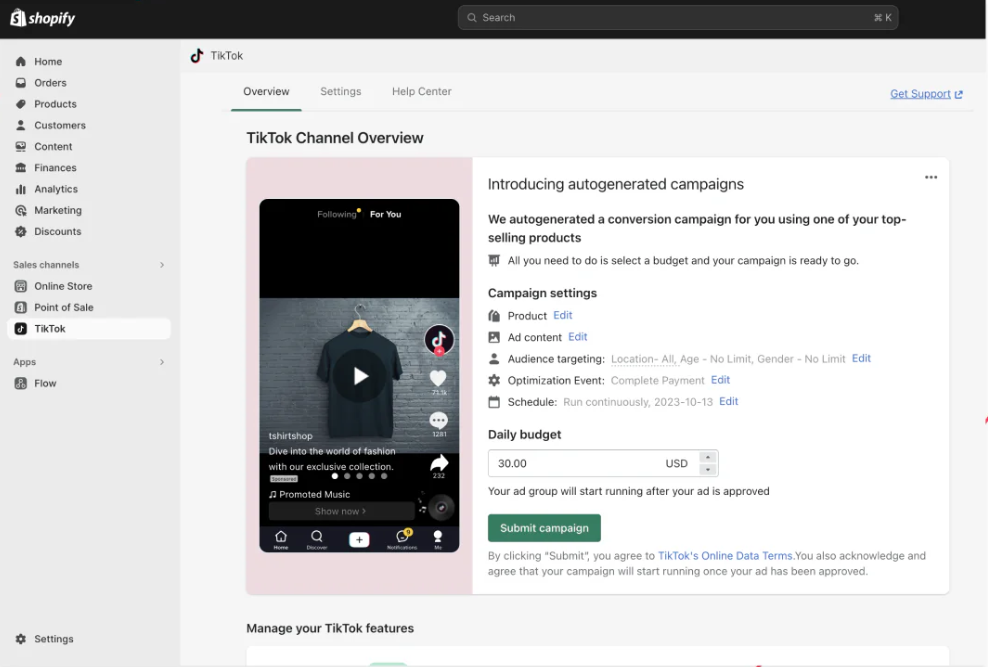 TikTok is similar to Pinterest in this regard. You need to download the TikTok app from the Shopify App Store to integrate your Shopify store with TikTok. Once the app is installed, it syncs your product catalog and allows you to run TikTok ads and track performance through Shopify.