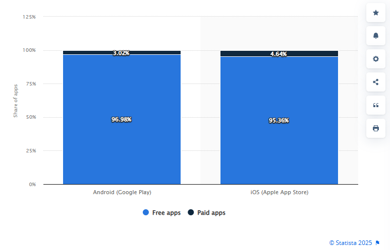 Initially, companies sold apps as paid versions, but with the increasing competition, paid downloads are gradually dying as there is always an app that can offer something similar for free. So today, only 3% of apps on Google Play and the Apple Store are paid. These are typically high-quality, niche offerings with no comparable alternatives. Most businesses have shifted to offering apps for free and monetizing them through different models and strategies. So, what are the most effective monetization strategies in 2025 when you can offer your app for free while still receiving income? We will discuss it further in this blog post.